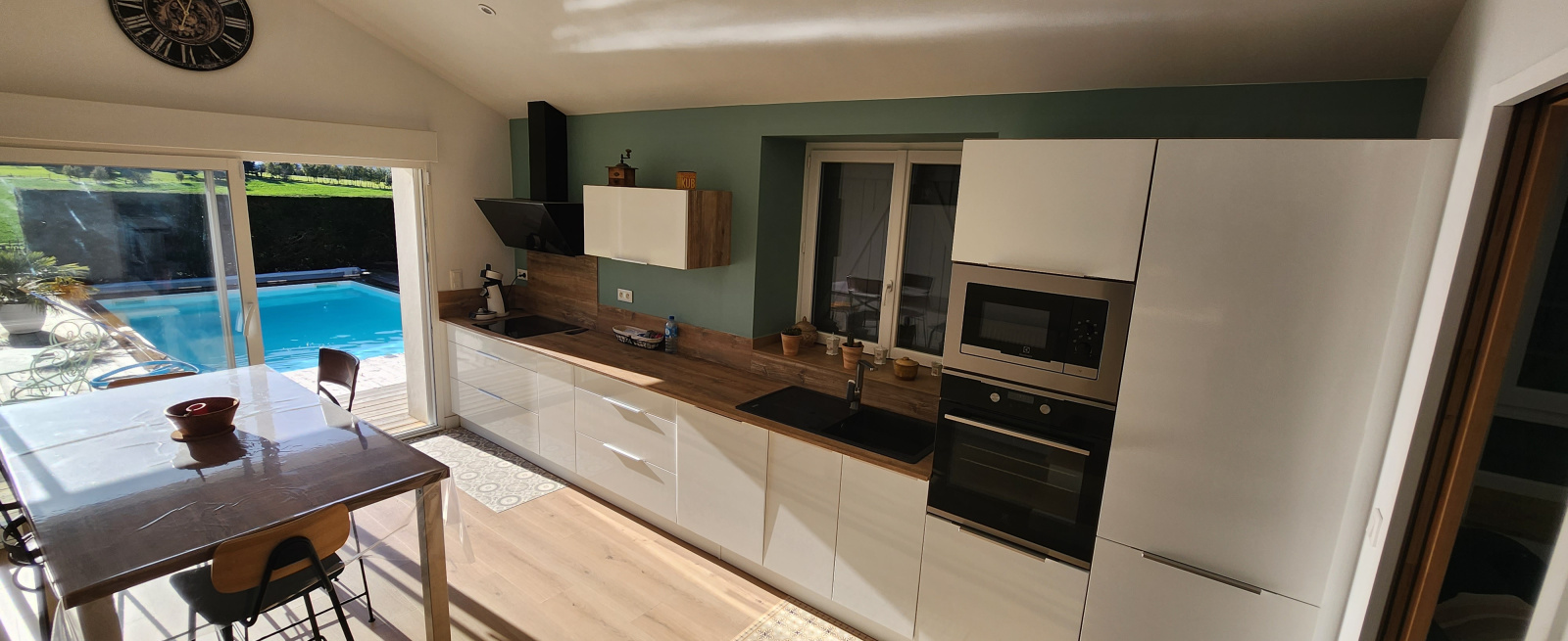 En rez de chaussée grande piece de vie donnant sur la cuisine toute équipée avec vue sur la piscine, chambre, salle d'eau et wc.